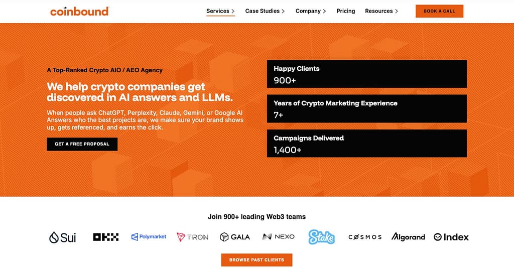 When it comes to AEO for Web3 brands, Coinbound is likely the leader. The agency has worked with more than 900 Web3 brands over eight years, including MetaMask, OKX, Nexo, Sui, Cosmos, eToro, Tron, Gala, and Immutable.